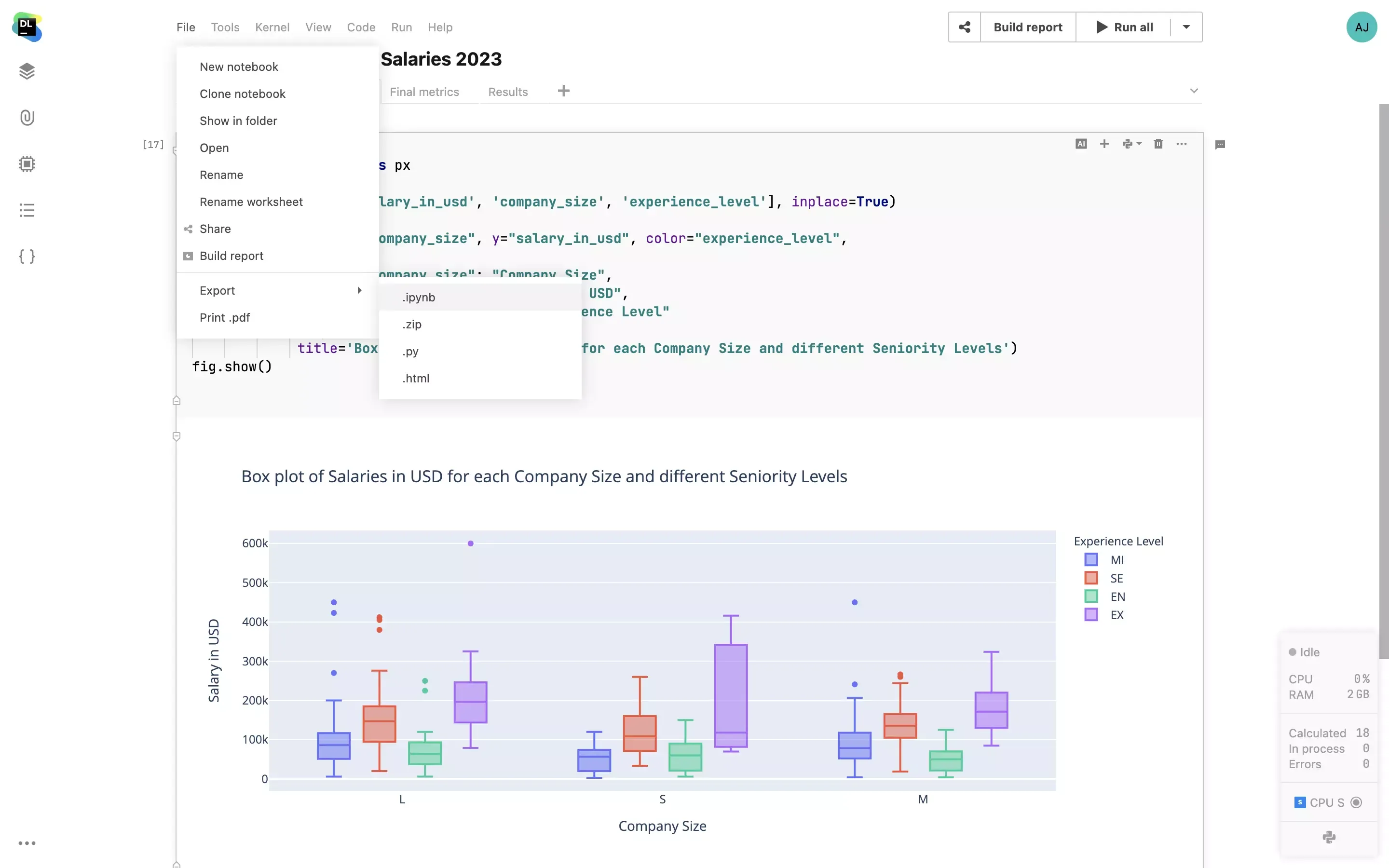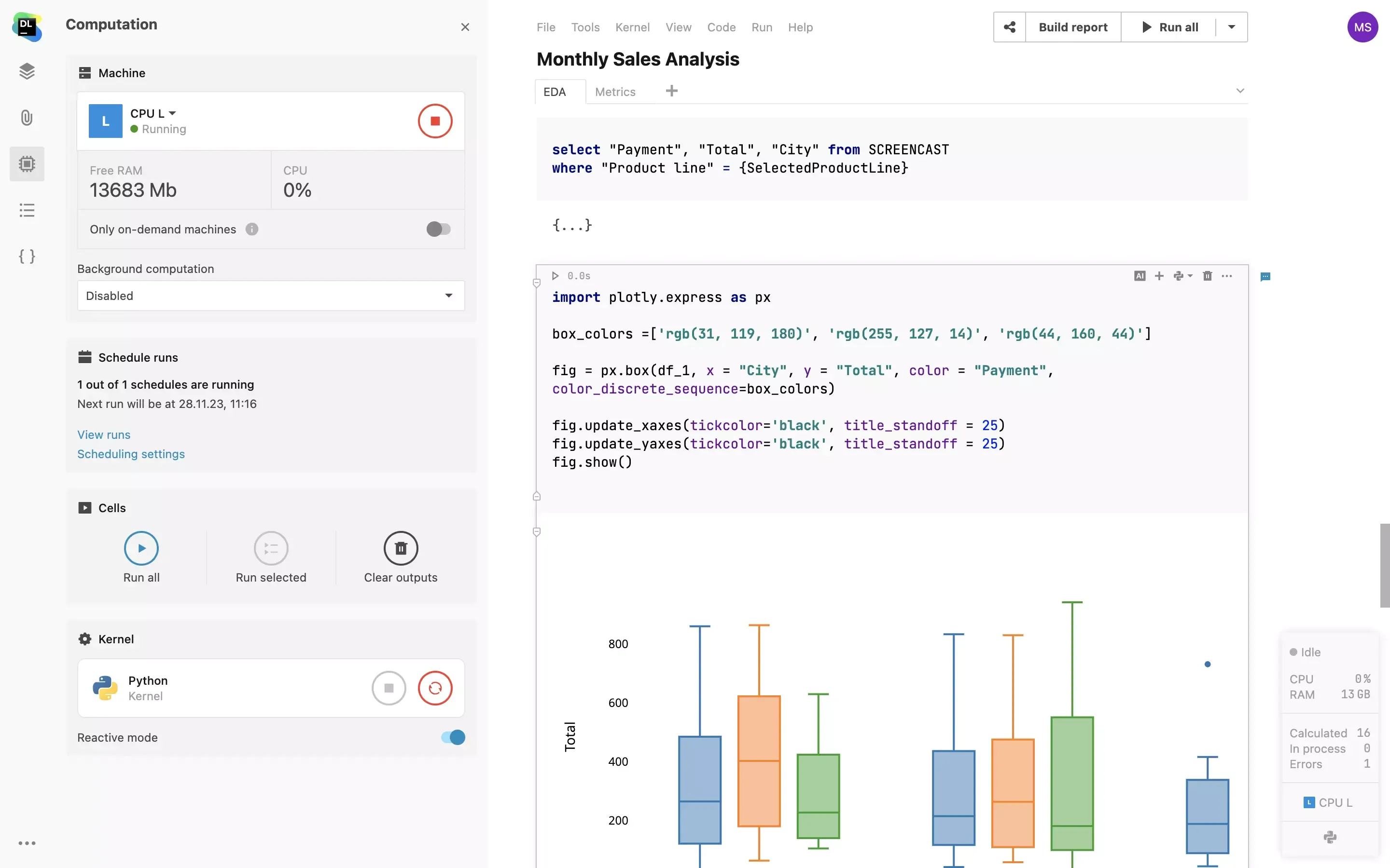 The heart of every data science project is a Jupyter notebook. Datalore offers intelligent tools for working with Jupyter notebooks. With the intelligent programming tools for Python, SQL, R, Scala and Kotlin, you can work faster and more efficiently and write better code. The Datalore editor gives you access to important tools such as attached data sources, automatic visualizations, dataset statistics, report generation, environment manager, versioning and more.